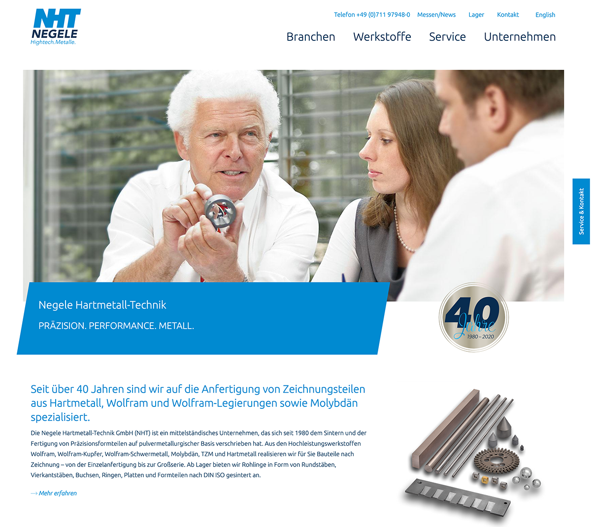 Die Negele Hartmetall-Technik GmbH (NHT) ist ein mittelständisches Unternehmen, das sich seit 1980 dem Sintern und der Fertigung von Präzisionsformteilen auf pulvermetallurgischer Basis verschrieben hat. Aus den Hochleistungswerkstoffen Wolfram, Wolfram-Kupfer, Wolfram-Schwermetall, Molybdän, TZM und Hartmetall werden für anspruchsvolle Kunden weltweit Bauteile nach Zeichnung realisiert– von der Einzelanfertigung bis zur Großserie.